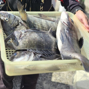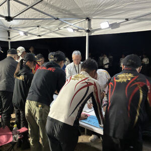 帰着後の検量風景。チヌ5尾までの総重量で競いました。