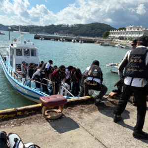 5:30 乗船開始 周りの参加者と楽しく話し合いながら、皆さん協力して順番に荷物を積み込んだ後に出港しました。