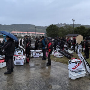 生憎、小雨が降りしきる中ですが、乗船を前にして選手の皆様もテンションが上がってきます。