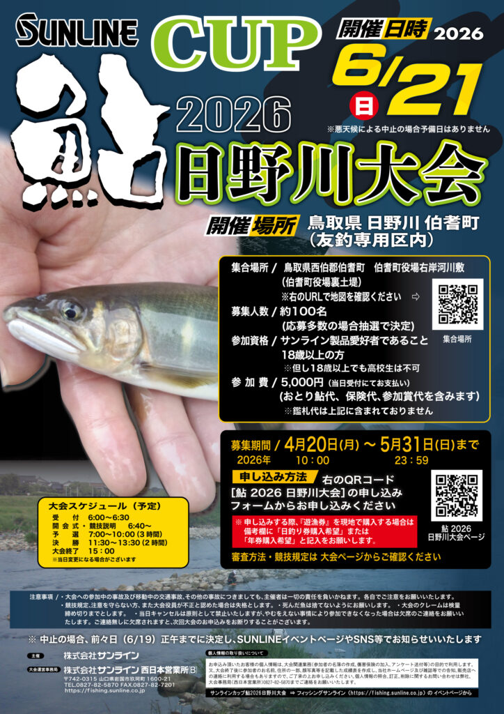 | イベント名 | サンラインカップ鮎 2026 日野川大会 | |